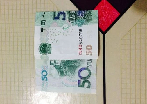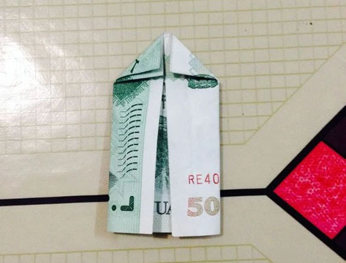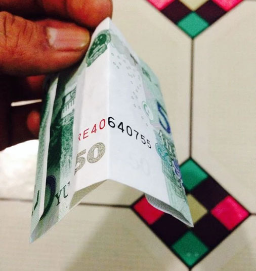 步驟1:沿著紙幣50中間的5字對折。