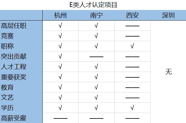 評定各級高層次人才的條款非常多,由于篇幅有限,這里我們只能將條款簡單的進行一個分類,然后結(jié)合前面例子中所涉及的城市杭州(新一線城市)、南寧(二線城市),再增加兩個熱門對比城市深圳(一線城市)、西安(新一線城市),為大家簡要介紹一下D類、E類高層次人才。