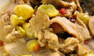 3、瀘州白果雞:烏骨雞1只,白果、蓮肉、糯米各15克,胡椒3克。將烏骨雞去毛、剖肚去腸雜,洗凈,把上述諸物裝入雞腹內,放入鍋中,加水適量煮至雞肉熟。
