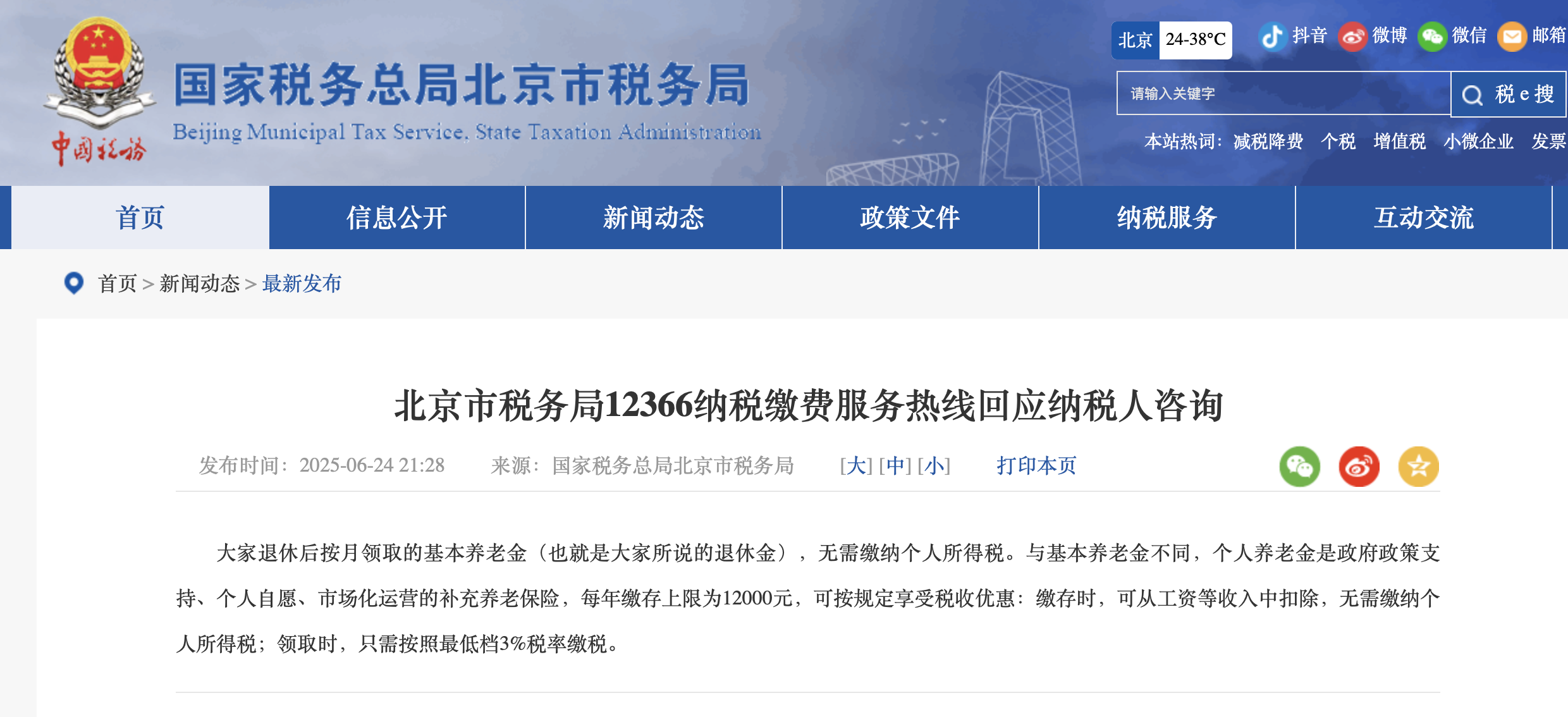 人民財訊6月24日電,北京市稅務局12366納稅繳費服務熱線回應納稅人咨詢稱,大家退休后按月領取的基本養老金(也就是大家所說的退休金),無需繳納個人所得稅。與基本養老金不同,個人養