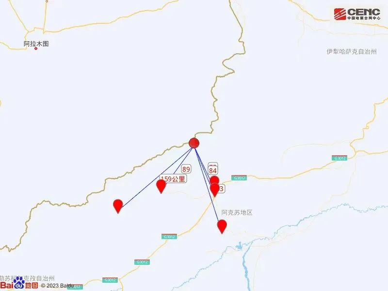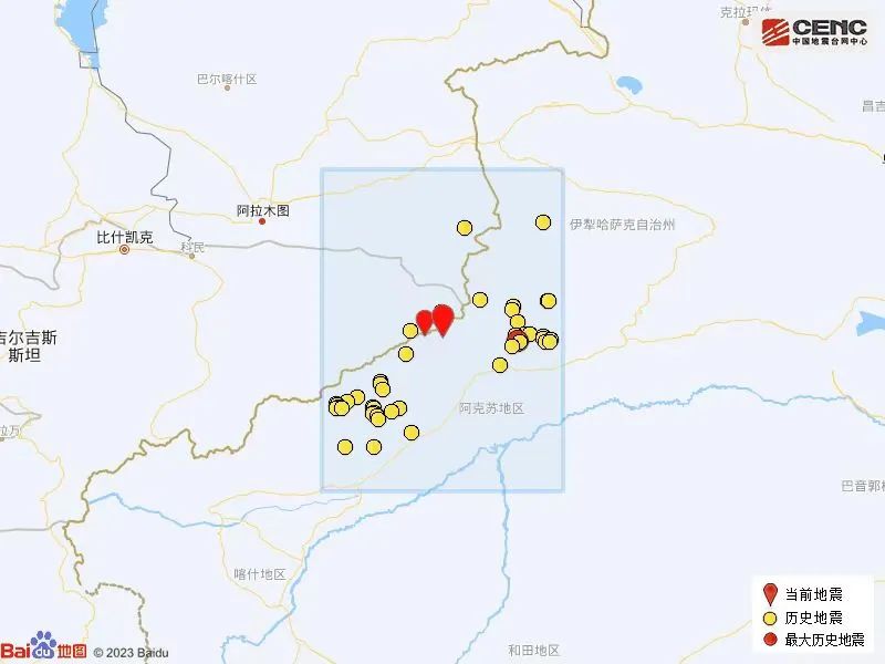 根據中國地震臺網速報目錄,震中周邊200公里內近5年來發生3級以上地震共115次,最大地震分別是2022年12月29日在吉爾吉斯斯坦發生的5.4級地震(距離本次震中24公里)和2021年3月24日在新疆阿克蘇地區拜城縣發生的5.4級地震(距離本次震中106公里)。