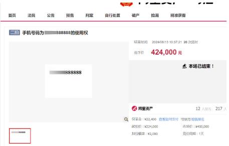 據媒體公開報道:鹽城市亭湖區人民法院在執行一起涉及某公司與多家企業及個人的買賣合同糾紛案件中,面臨執行難題,被執行人名下無可供執行的財產。然而,執行法官發現被執行人之一持有的尾號“888888”手機號具有潛在市場價值。法院迅速行動,聯系運營商核實信息,并啟動了查封與拍賣程序。最終該手機號被人以42.4萬元的最高價競得。