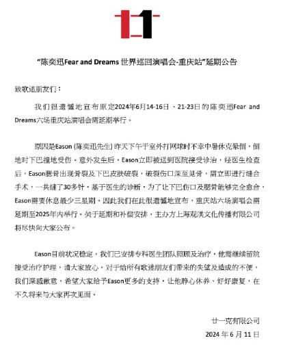 6月11日,@陳奕迅 Fear and Dreams 巡回演唱會(huì) 官方微博發(fā)布重慶站延期公告,稱(chēng)陳奕迅因打網(wǎng)球中暑休克暈倒,導(dǎo)致下巴撞地受傷。意外發(fā)生后,陳奕迅立即被送到醫(yī)院接受診治,一共縫了