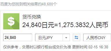 按照今日匯率1日元等于0.05134人民幣,1人民幣19.4765日元計算,30000日元1540.3179人民幣,24840日元兌換1275.3832元人民幣。