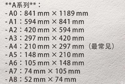 A4紙是國(guó)際標(biāo)準(zhǔn)化組織(ISO)制定的A系列紙張尺寸之一,其尺寸為210毫米寬乘以297毫米長(zhǎng)。A4紙是標(biāo)準(zhǔn)辦公和打印用紙,非常普遍。