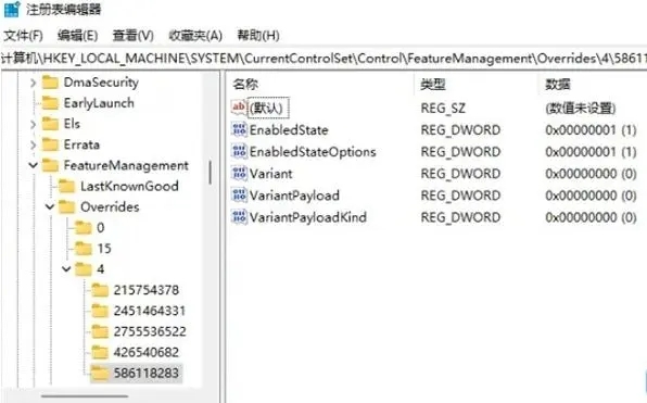 3、將“HKEY_LOCAL_MACHINESYSTEMCurrentControlSetControlFeatureManagementOverrides4”復(fù)制到上方路徑中。