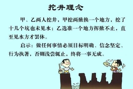 挖井的故事講述的是第一個人挖了很深,挖不到水,放棄了;而第二個人堅持挖下去卻挖到水了。