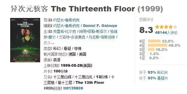 在一棟公共大樓的十三樓,想象力豐富的道格拉斯-霍爾和漢農-富勒將虛擬現實發揮到了極限,他們在計算機上模擬了1937年的洛杉磯.....另類穿越,虛擬與現實之間,分不清的夢中夢,虛擬世界之中的虛擬世界。格局和《盜夢空間》很像。