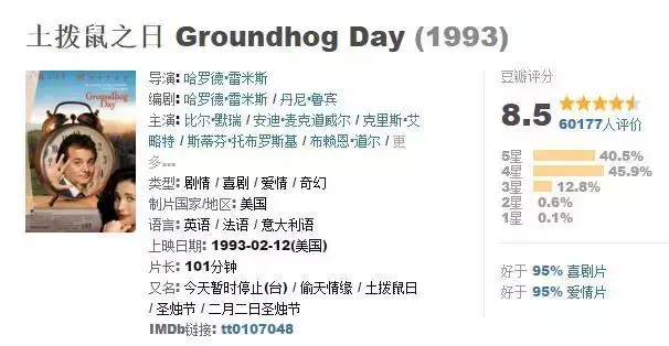 時空循環電影中的經典。一個氣象播報員在每年的2月2日要前往一個名為普蘇塔尼的邊境小鎮,報導當地的土撥鼠日慶典。但有一次因為突如其來的暴風雪,耽擱了他回家。第2天醒來后,菲爾意外地發現時間仍然停留在前一天土撥鼠日,昨日的一切重新上演。驚訝、不信、刺激、狂喜、煩悶、焦慮、不安、絕望、倦怠等各種情緒輪流侵占他的感官領域,可無論他如何選擇度過這一天,他都始終無法再前進一步,開始了他重復的人生。