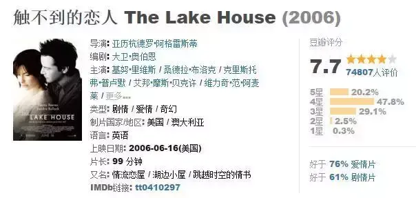 該片主要講述了生活在不同年代、同一住宅中的女醫生凱特·福斯特和建筑師亞力克·維勒之間借奇妙的郵箱書信傳情的浪漫故事。美版更注重劇情,特別是男女主角在時間和空間的交錯,他們之間關系的微妙變化和演繹顯得極為自然,幾乎毫無破綻可言,使得平行的故事結構里透著一種張力。