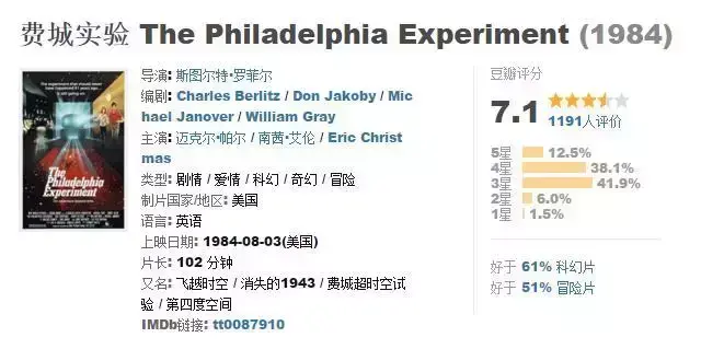 1943年10月,美國海軍在費城進行了一次人工強磁場的機密試驗,即著名的“費城實驗(The Philadelphia Experiment)”,實驗成功地將一艘驅逐艦及全體船員投入另一空間。此后,一些船員身上仍留有實驗的反應,不論在家里,在街上,在酒吧間或飯店里,都會突然地消失又重現,讓旁觀者驚訝不已。費城實驗的進行具有著深遠的意義, 它不僅證實了自然界中的確有我們看不到的另外空間的存在,同時也表明了將人類及裝備暫時投入另一空間的可行。