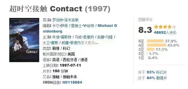 《超時空接觸》以一次人類接觸地外文明的假定,構筑了情感充沛的科幻奇想,且這種手法與傳統好萊塢科幻大片有著很大不同,電影不僅將科學與宗教兩者進行了對決,更有著嚴謹理論“蟲洞”的科幻假設,該片改編自天文學家出身的卡爾·薩根的小說,引人思考的內涵,雖然偏重于文藝色彩。 講的又是從天文觀測、地外生命探索一直到蟲洞穿越的故事,與其說這是科“幻”,不如說它是一次嚴謹的科學假設。生命與宇宙的奧義形成了電影的最強科幻,宇宙之廣太空之美讓人震撼。