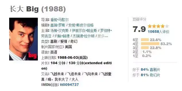 向古老的許愿機許下愿望,12歲的喬什一覺醒來變成了32歲,然而隨著工作、生活、愛情這些成人世界的壓力開始向喬什逼近,喬什那顆剛滿13歲的心漸漸感到困倦失落,他開始回想,這是否就是自己想要的成長…… 片子里,年輕的湯姆·漢克斯呆萌有趣,沒看過就去看看吧。