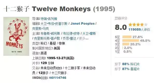 講述在公元2035年,世界被一種致命病毒侵襲之后,剩余的少數人類只能生活在地下,茍且偷生。為了改變這一情況,科學家們設計出一個計劃去改變這一切并最終找到了釋放病毒的罪魁禍首:十二猴軍團的故事。電影最后形成一個“環”,這是輪回,也是宿命。。。