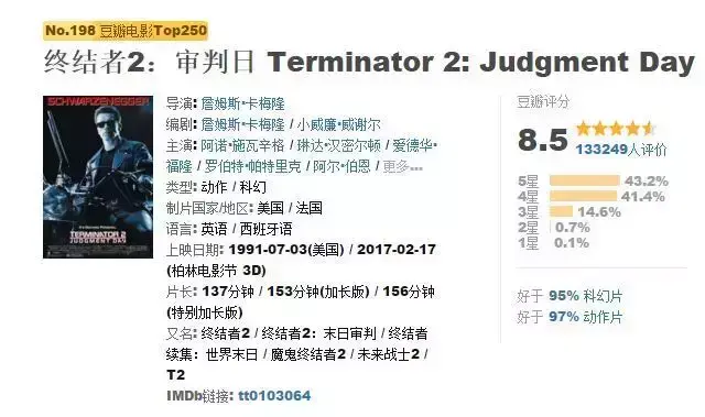 如果你沒有看過這一部,對不起,我確實不知道說什么了。經典中的經典,阿諾從未來穿越到現在,保護未來的領袖約翰康納,由此產生出的一段人與機器人的感情。阿諾穿越而來時光著的屁股,最后進人溶漿前那個豎起的大拇指,不說了,我要再去刷一遍。