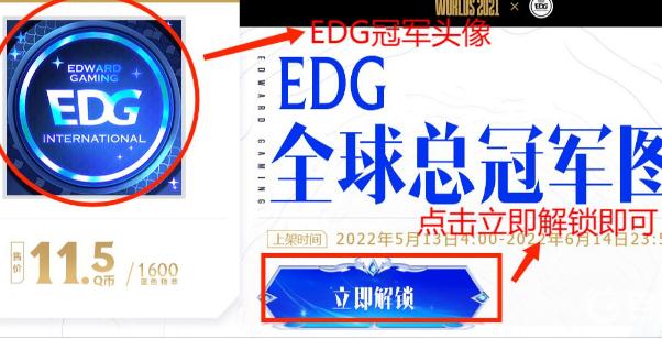 2.進入“EDG冠軍戰(zhàn)隊皮膚”頁面后,下拉找到EDG全球總冠軍圖標,點擊“立即解鎖”即可購買EDG的冠軍頭像。